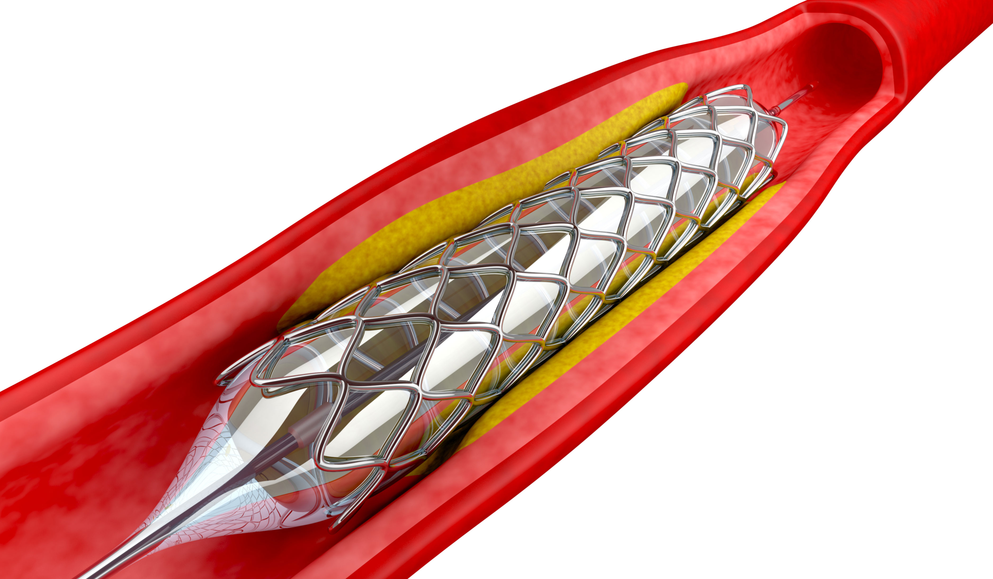 - A mesh stent may also be inserted to hold the artery open.